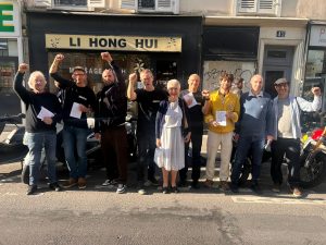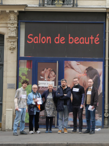 Le samedi après-midi, des hommes de Zéromacho se rassemblent devant l’un des 425 prétendus « salons de massages » asiatiques de Paris qui sont des lieux de prostitution. Ils attirent l’attention des passant·es sur le caractère illégal de ce commerce, et leur proposent de signer la pétition demandant l’application de la loi Olivier-Coutelle de 2016.